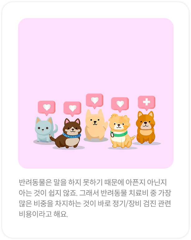 반려동물은 말을 하지 못하기 때문에 아픈지 아닌지 아는 것이 쉽지 않죠. 그래서 반려동물 치료비 중 가장 많은 비중을 차지하는 것이 바로 정기/장비 검진 관련 비용이라고 해요.