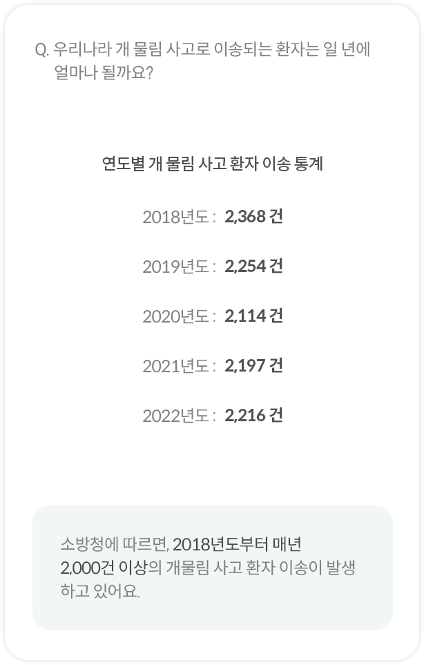 Q. 우리나라 개 물림 사고로 이송되는 환자는 일 년에 얼마나 될까요?